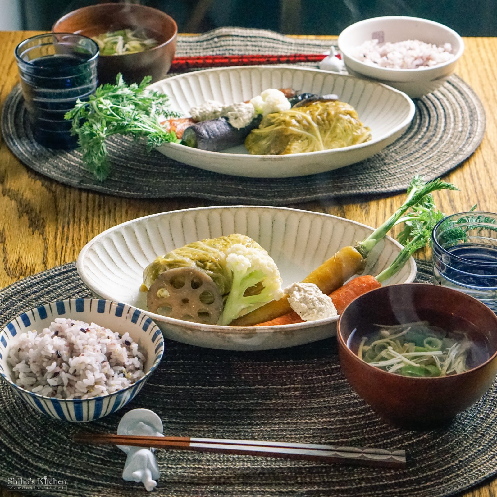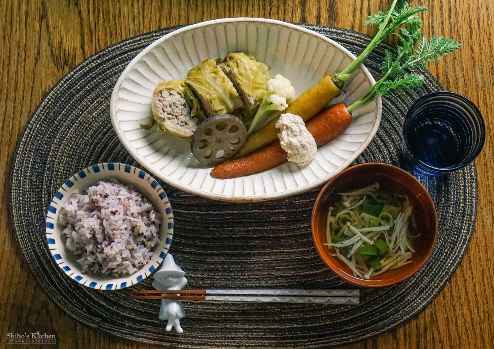 息子のお昼寝中に、いつぞやのお料理写真を出すよ。メインは和風ロールキャベツです。