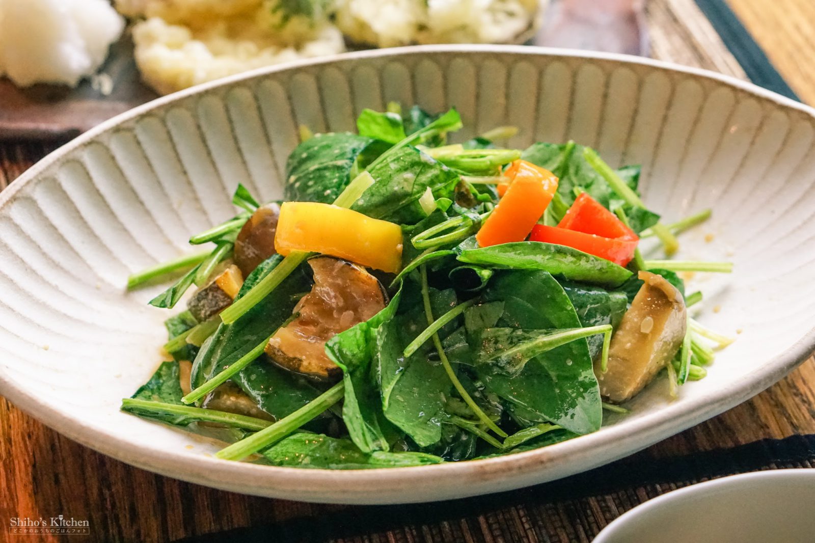 ほうれん草のサラダは、白バルサミコ酢で漬けておいたパプリカと茄子のマリネを混ぜ込んで、オリーブオイルと醤油麹で味付け。
