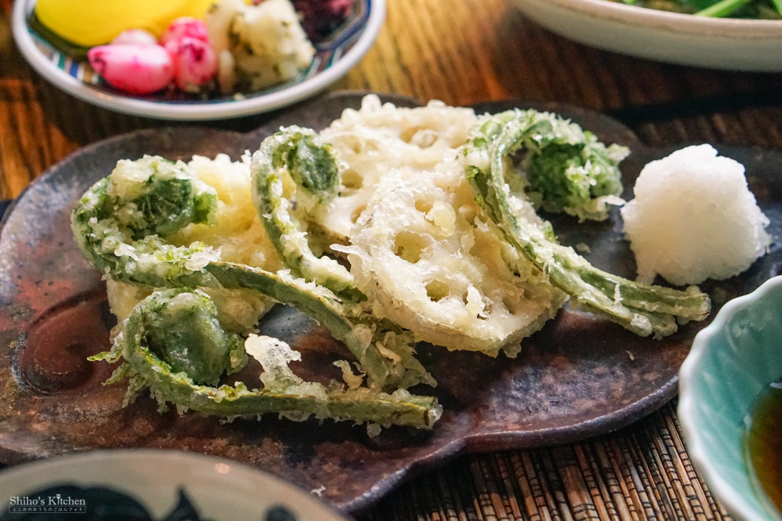 こごみは下茹でして天ぷらに。せっかく油を使うので、れんこんも一緒に揚げました。