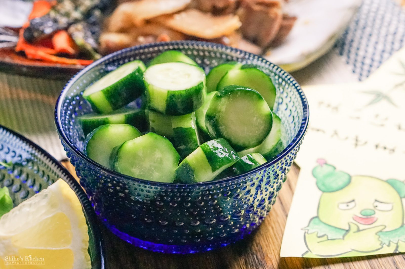 きゅうりは塩振って板ずりしてごま油と鶏ガラスープで和えただけのかんたんおつまみ。