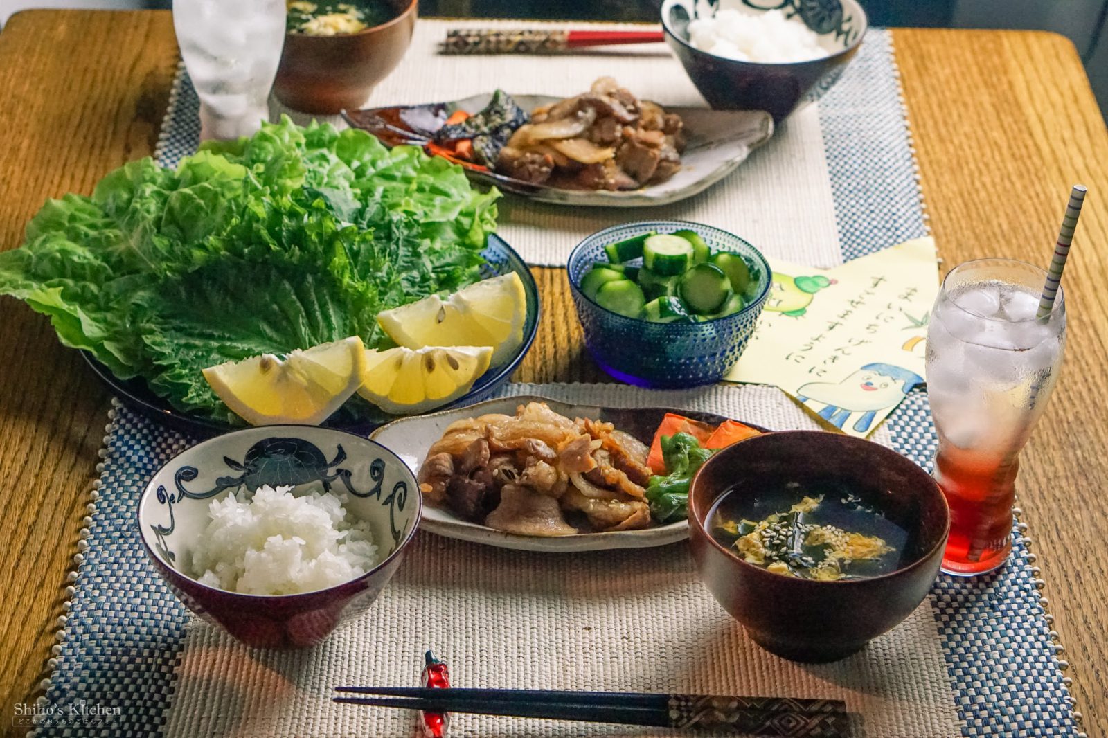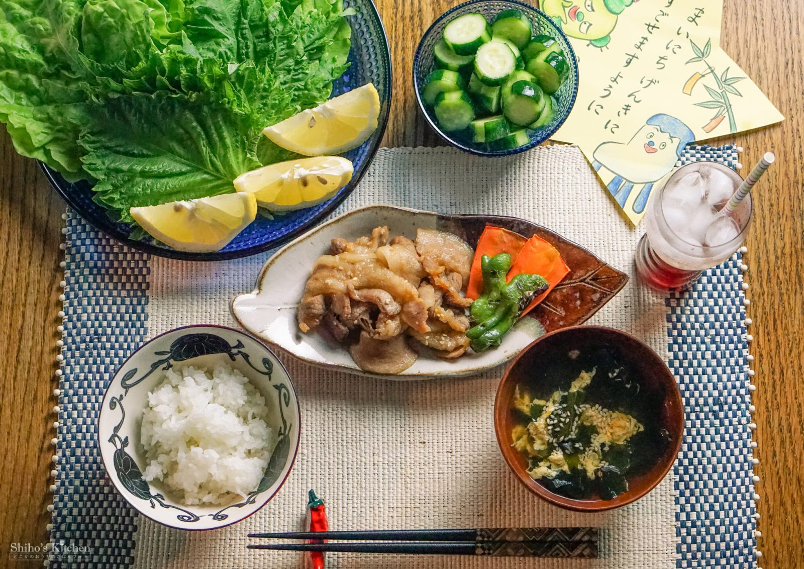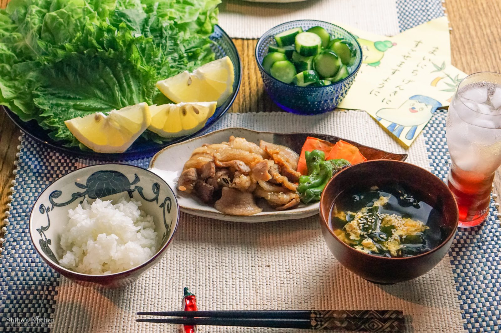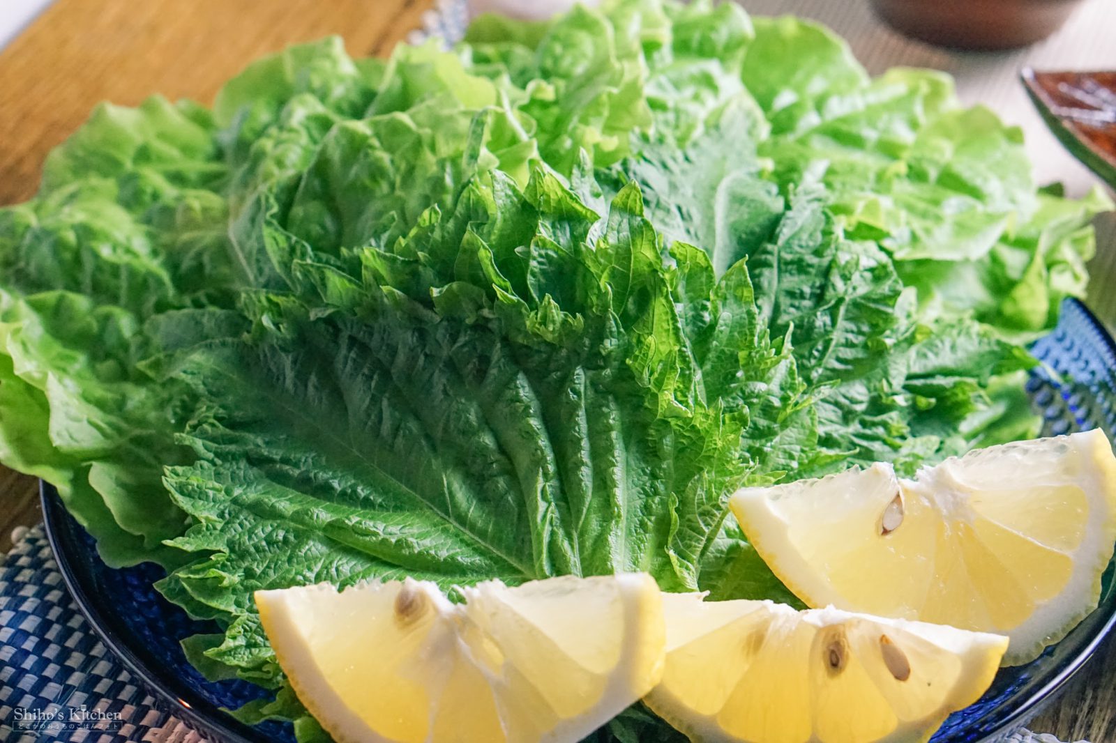 サンチュと手のひらほどもある大葉に包んでどうぞ。私の実家で育った巨大レモンを絞っても美味しいよ。