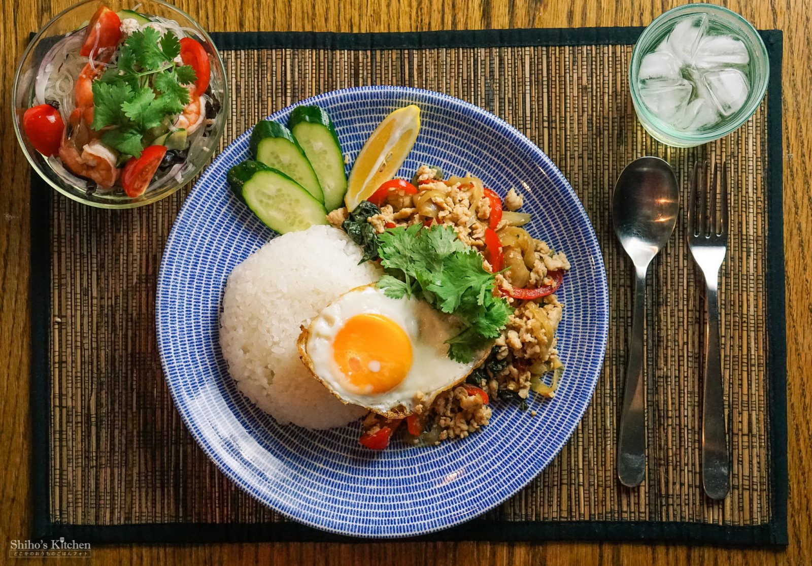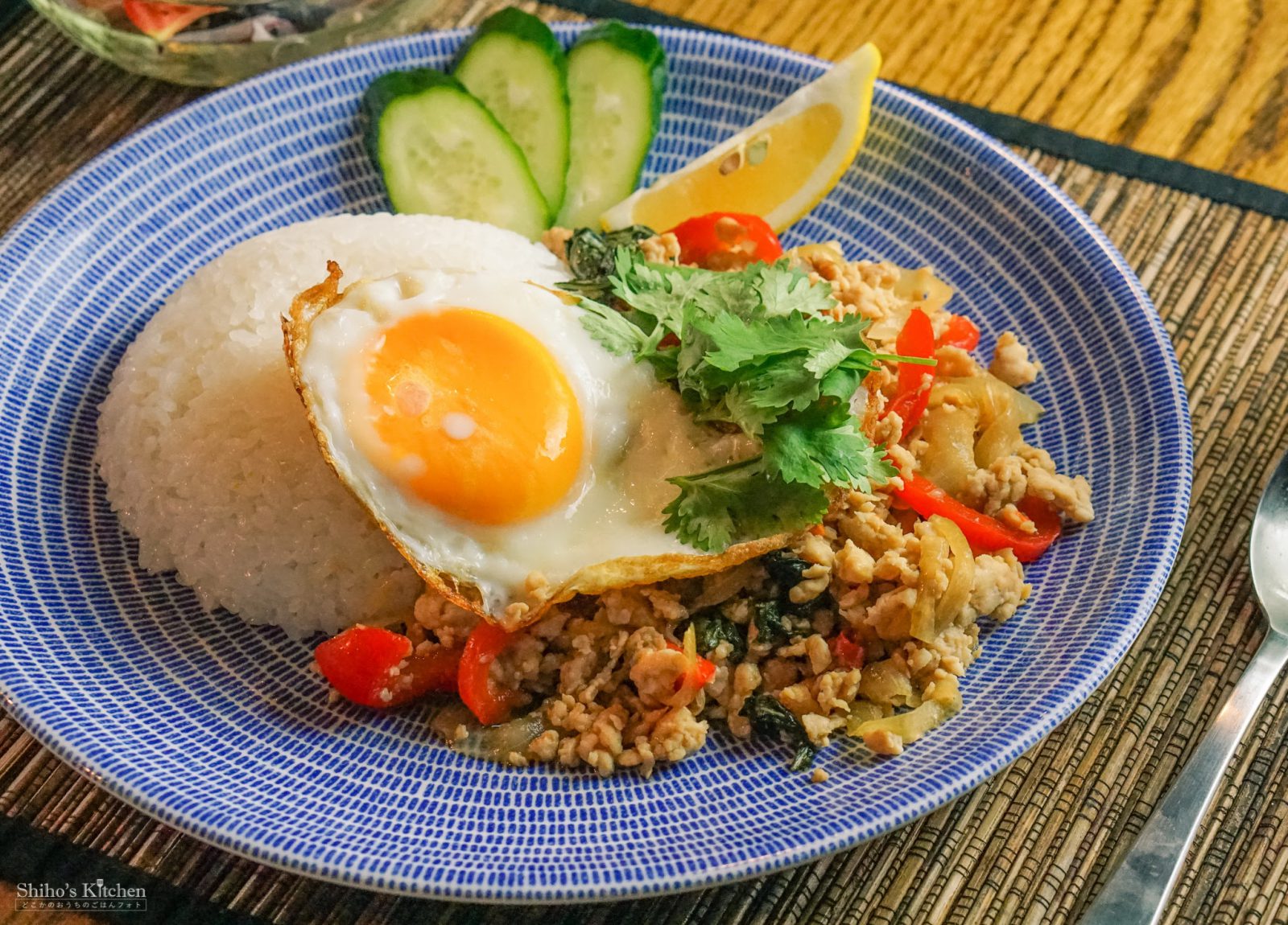 ガパオは、赤パプリカ、玉ねぎ、鶏むね肉のミンチに、冷蔵庫で持て余していたバジルの葉を大量投入。
