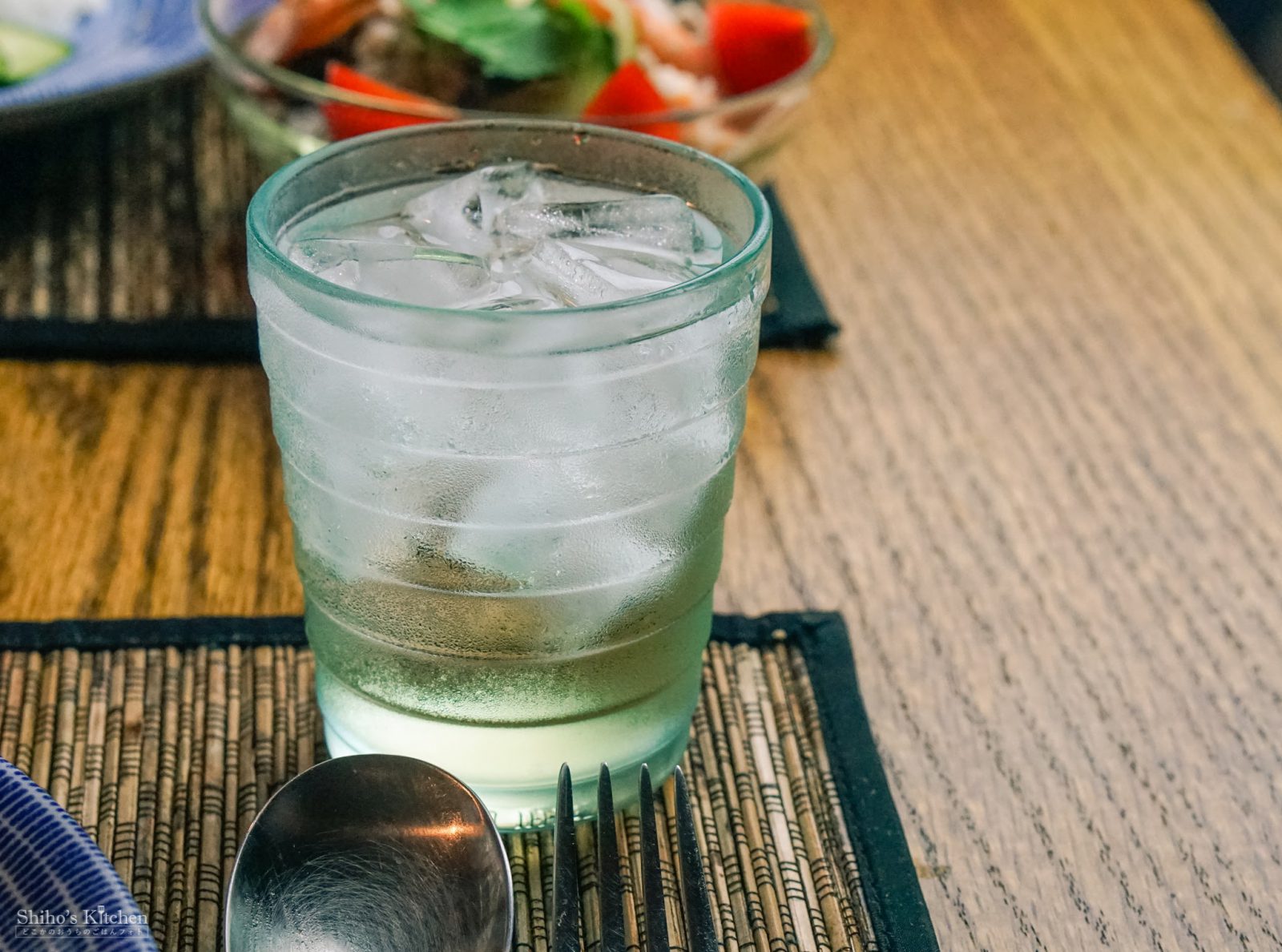 グラスには、OSUYAのアロマビネガー・ジュニパーベリーの水割り。