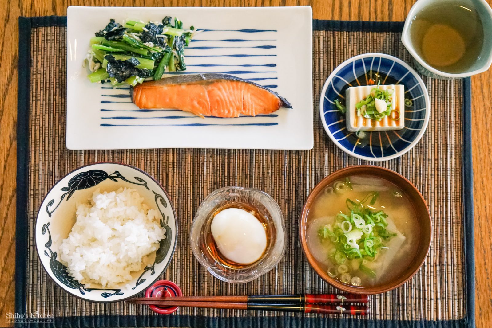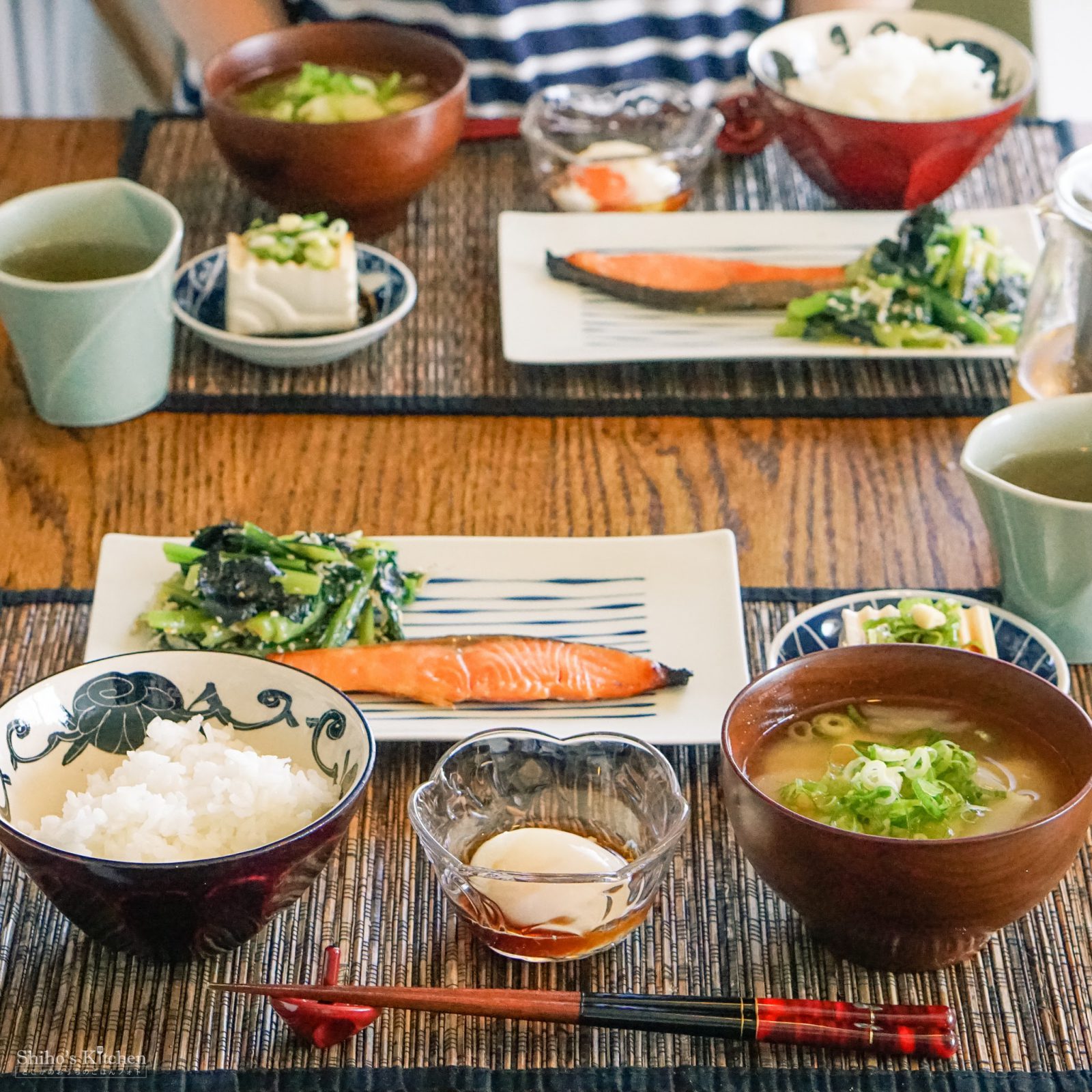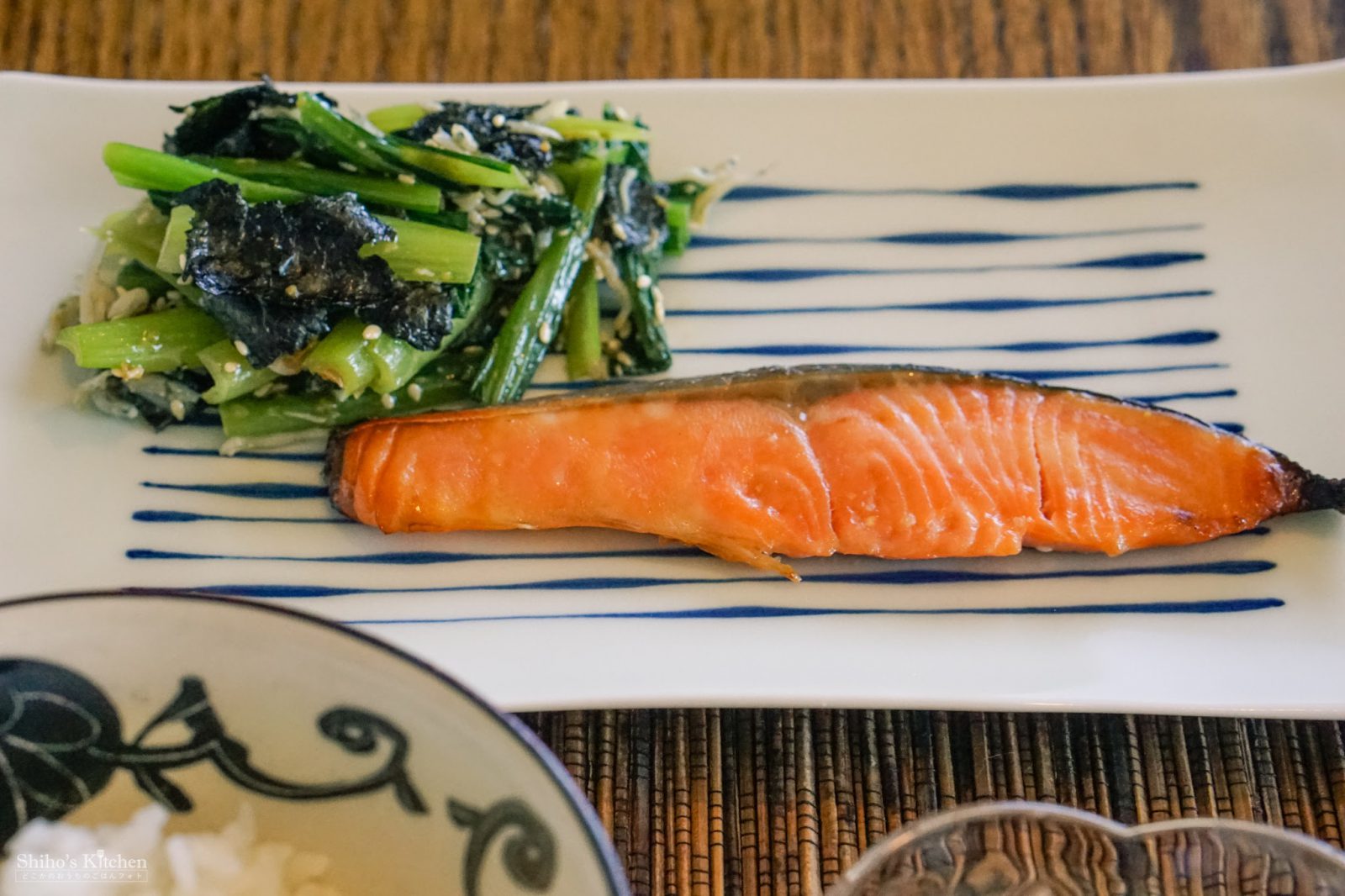 鮭の西京漬けと、小松菜・もみ海苔・しらすを醤油麹・亜麻仁油・胡麻で和えたのと、