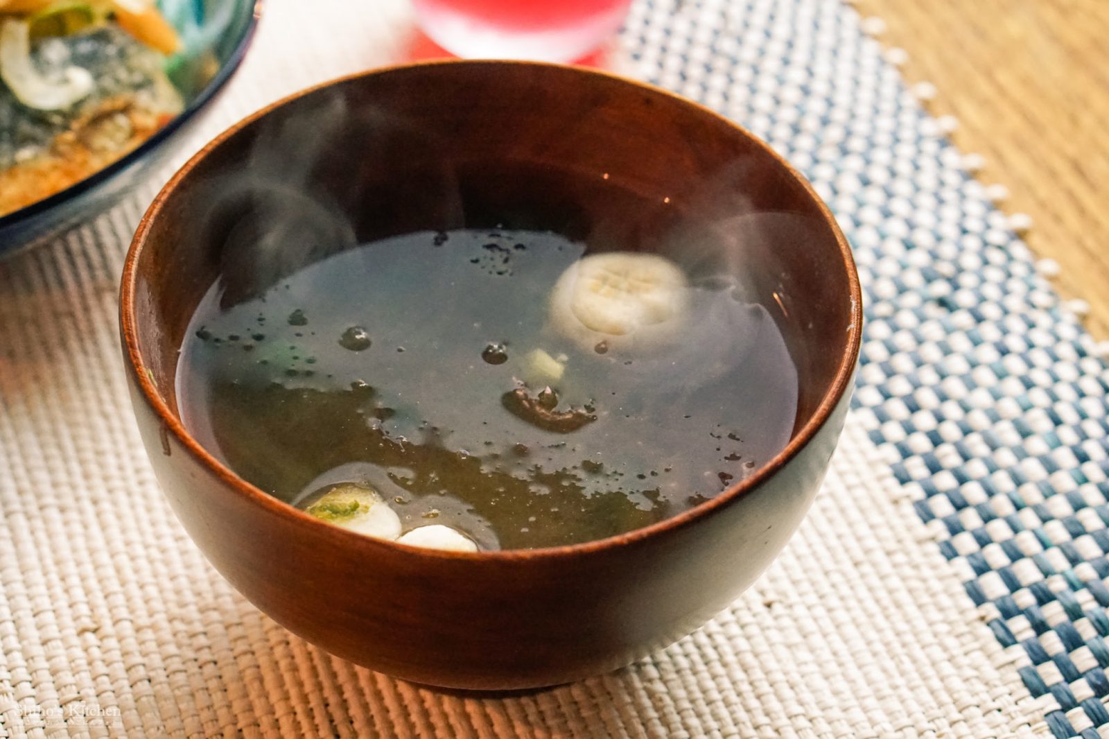 お吸い物は、皆美の出汁パックでとった出汁にミックス乾燥海藻を入れただけの即席スープ。