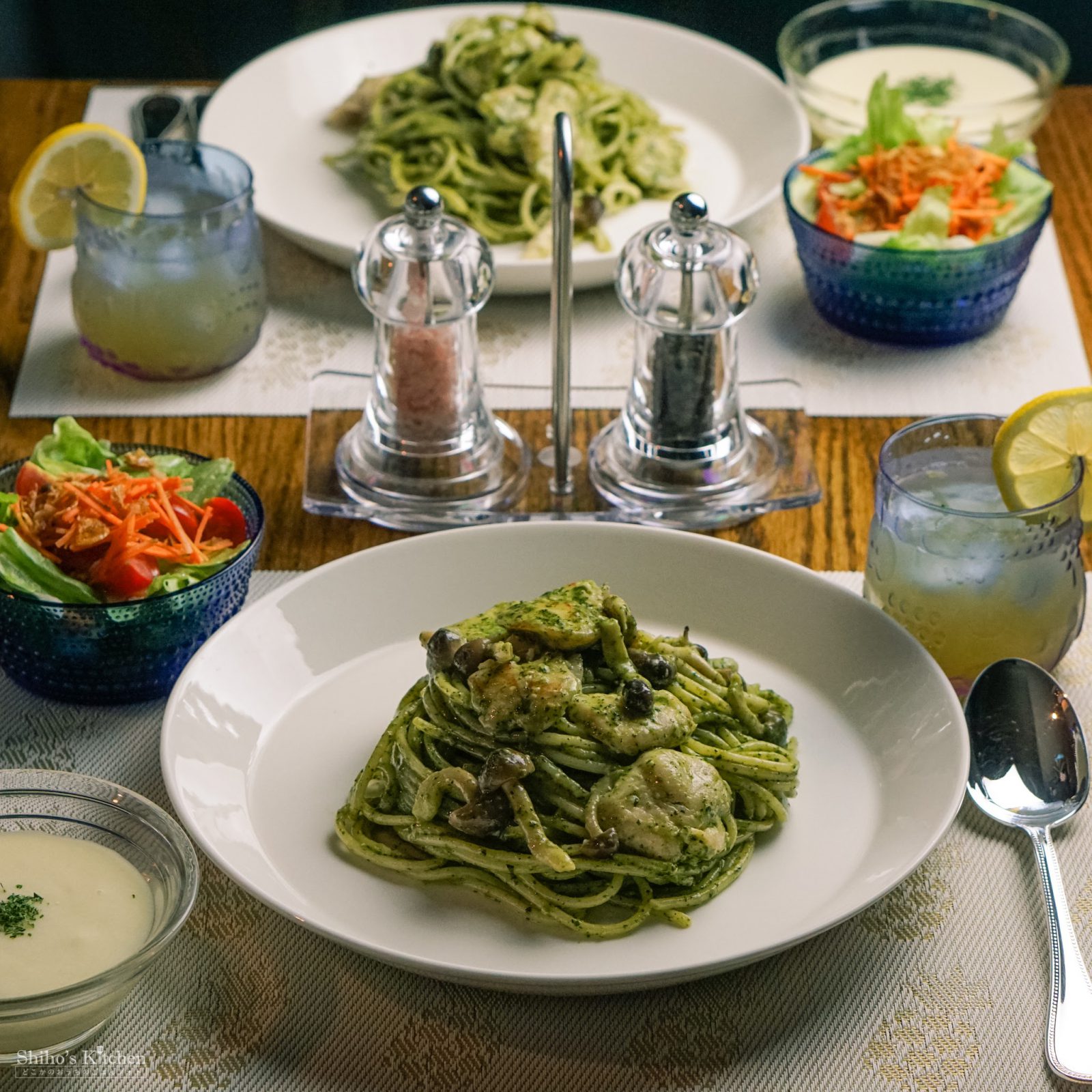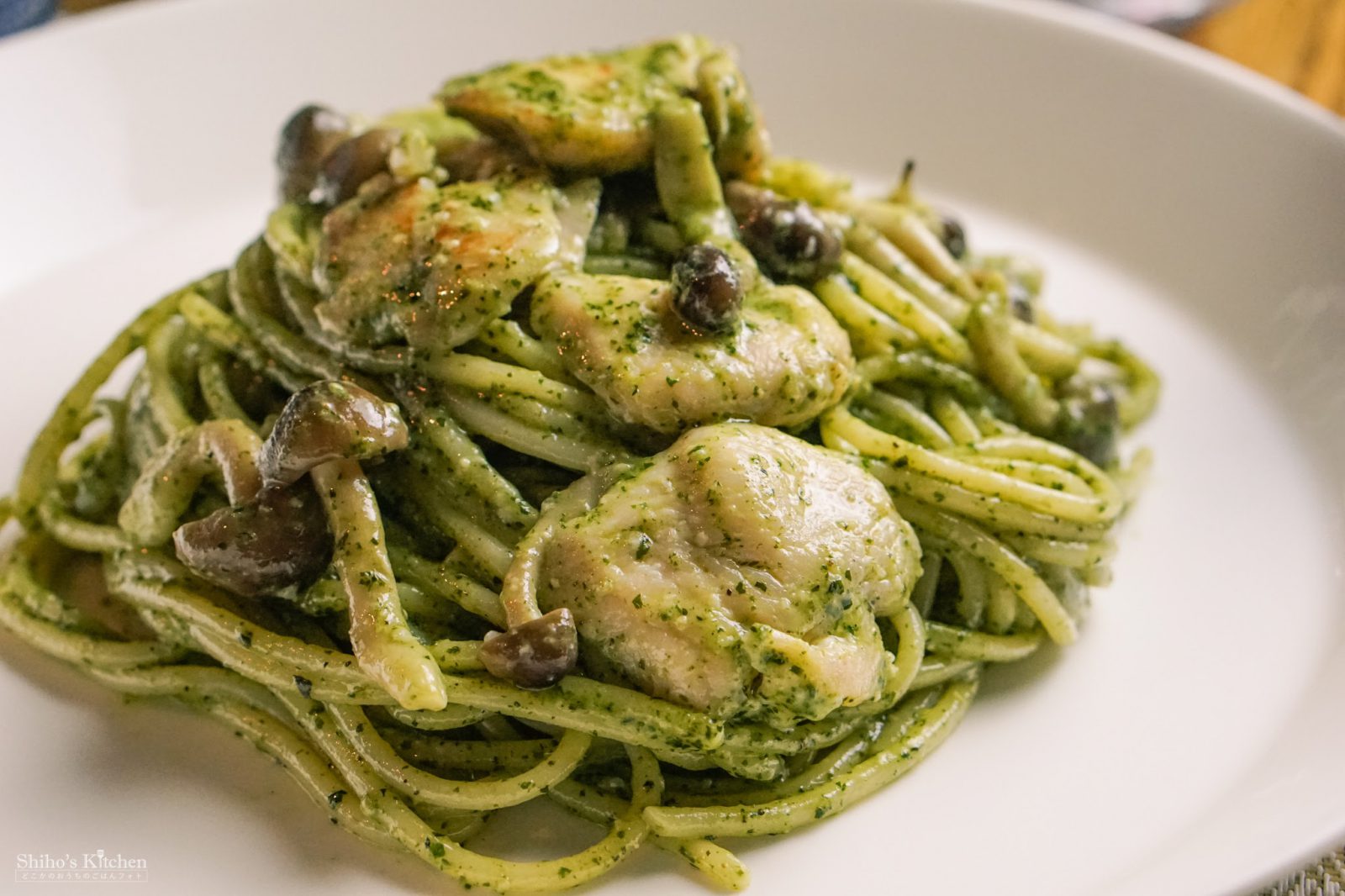 塩麹に1時間ほど漬け込んだ鶏むね肉としめじをオリーブオイルで炒めて(塩麹は炒める前に軽く拭き取る)、茹でたフェットチーネを入れてサッと炒め合わせて火を止めて、ジェノベーゼソースを加えて混ぜ合わせたら、塩麹チキンのジェノベーゼパスタの出来上がり。