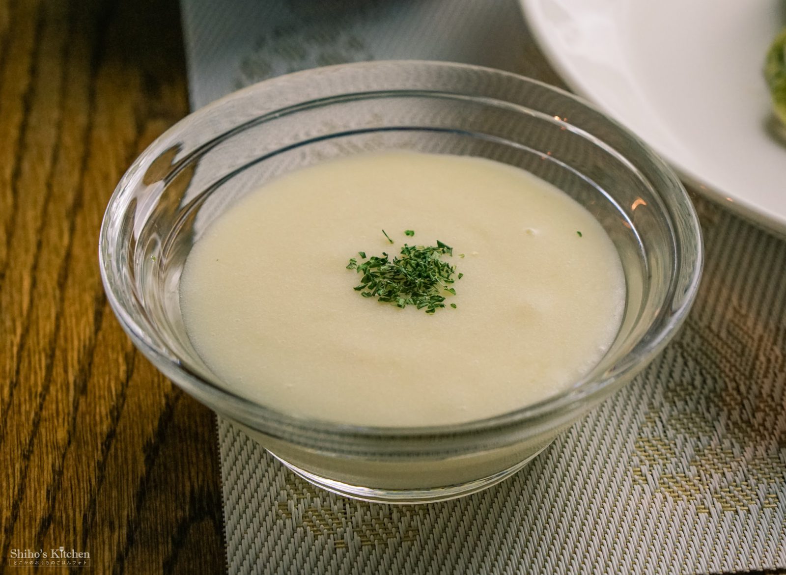 スープはビシソワーズ。玉ねぎとじゃがいもをバターで炒めて、少しの水とコンソメを足してクタクタになるまで煮て、牛乳と一緒にミキサーでガッとして、冷やしておきました。