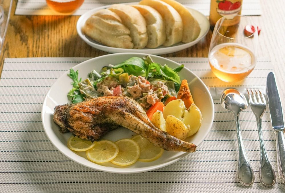 - ハーブチキン(ハーブ塩とオリーブオイルをまぶしてオーブン焼き)