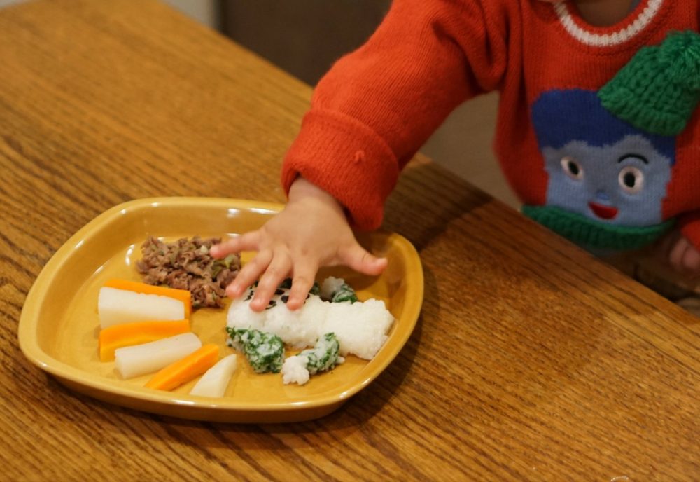 1歳ホヤホヤの坊やは、牛肉、トマト、イチゴ、卵豆腐がお好き。