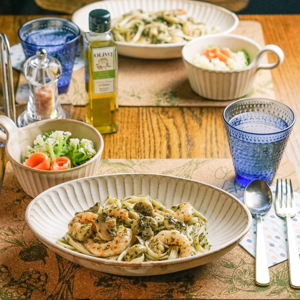 茹でたパスタ(塩不要)と、オリーブオイルで炒めた剥き海老とマッシュルームを、バジルペーストで和えるだけ。簡単!
