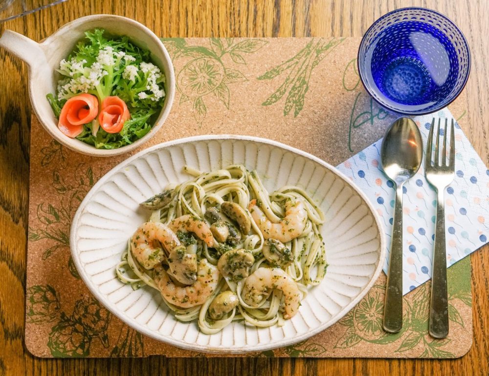 バジルペーストもちょうどいい塩加減で、モチモチの麺によく合いました。食べ終わって数時間経つけど、まだお部屋中、バジルの香り。