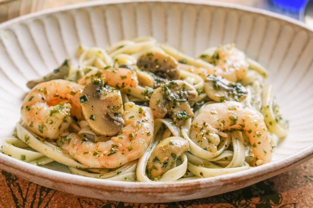 パスタは乾麺なのに食感が生パスタのようなモチモチ感で、口の中でほんのりガーリックが香ります。