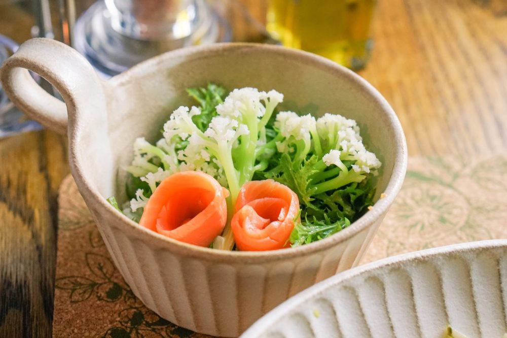 わさび菜の緑に、かすみ草みたいなカリフローレが映えてよい♡サーモンは薔薇のつもりです。ドレッシングは笠原さんのこちら↓