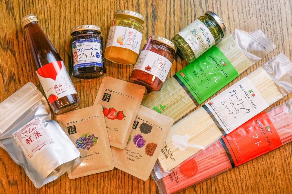 木之内農園さんのジャム、阿蘇健康農園のバジルペーストとパスタとトマトコーラ、南阿蘇オーガニックのハーブティー、宮崎製茶の特上茶(写真撮り忘れ!)と和紅茶。