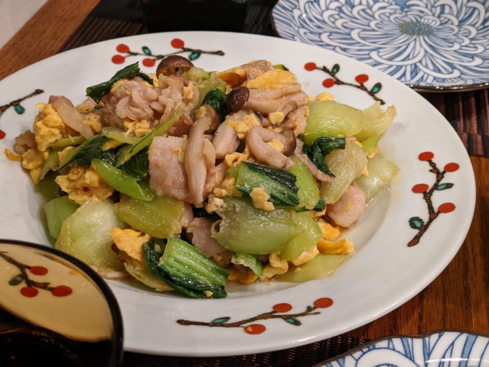 - ちんげん菜と豚バラの卵炒め