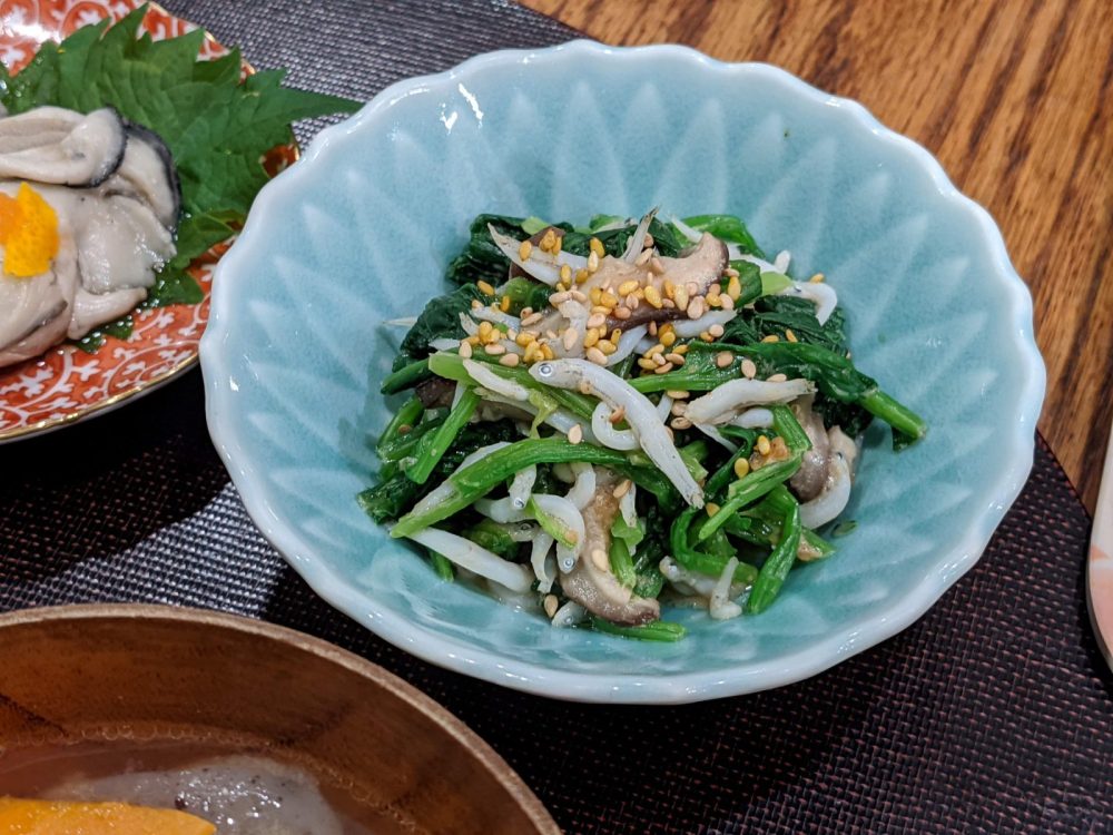 - ほうれん草、椎茸、しらすの胡麻おひたし