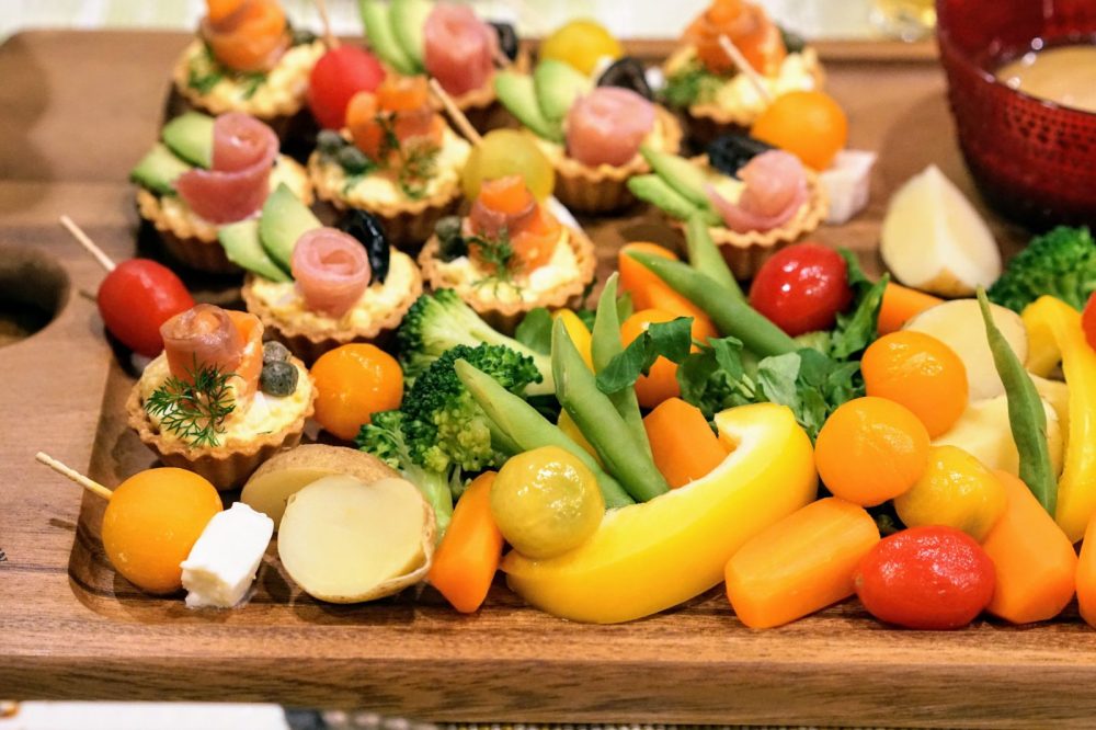 スモークサーモンや生ハムでバラを咲かせて、アボカド、ケイパー、オリーブ、ディルなどで飾り付け。